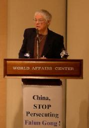 国会议员汤姆-兰托斯(Tom Lantos)的助理玛其瑞-法威尔(Margery Fawar)女士到会发表声明支持法轮功学员为争取基本人权的和平努力。法威尔女士在回答记者提问时说,兰托斯先生十分关注中国人权现状和法轮功学员的处境,正是基于对中国和中国人民的尊重和关心。