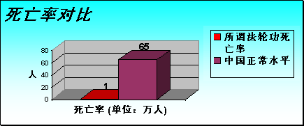 | 按照江泽民的说法,法轮功有成员230万(这个数位显然是大大缩小的,姑且不论),在七年间死了1400人(真假暂且不论),平均每年200人,死亡率是每年不到万分之一(0.01%),远低于0.65%的正常死亡率。 |