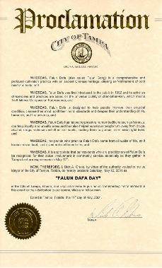 佛罗里达州坦帕市宣布2001年5月12日为“法轮大法日”。