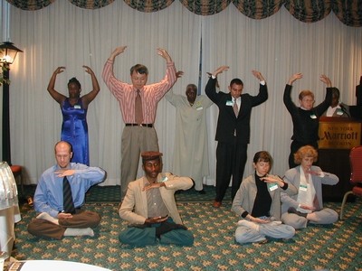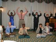 最后学员们展示了祥和优美的五套功法,多为西方学员,大堂寂寂无声,只闻音乐回响,客人们被学员们投入的表演深深地吸引住了。两位来宾更是急不可待地学炼起来,动作虽笨拙可爱,神情却严肃认真。