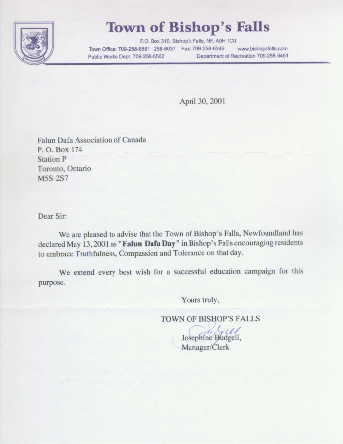【明慧网2001年5月12日】加拿大纽芬兰省彼涉普斯沸斯镇宣布2001年5月13日为“法轮大法日”。