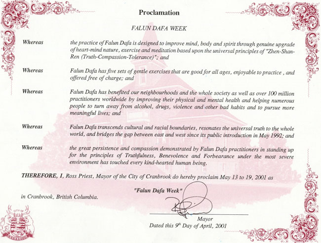 【明慧网2001年5月13日】加拿大不列颠哥伦比亚省克兰布鲁克市宣布2001年5月13-19日为“法轮大法周”。
