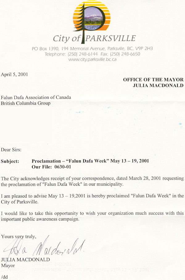 【明慧网2001年5月13日】加拿大不列颠哥伦比亚省帕克斯威利市宣布2001年5月13-19日为“法轮大法周”。