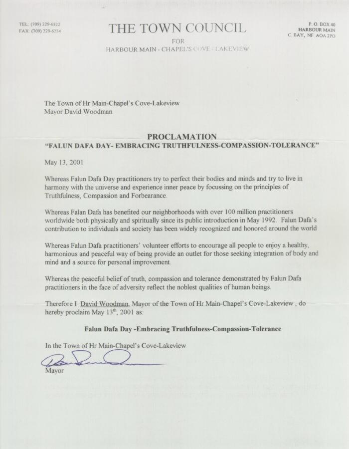 【明慧网2001年5月13日】加拿大纽芬兰省主港市宣布2001年5月13日为“法轮大法真善忍日”。