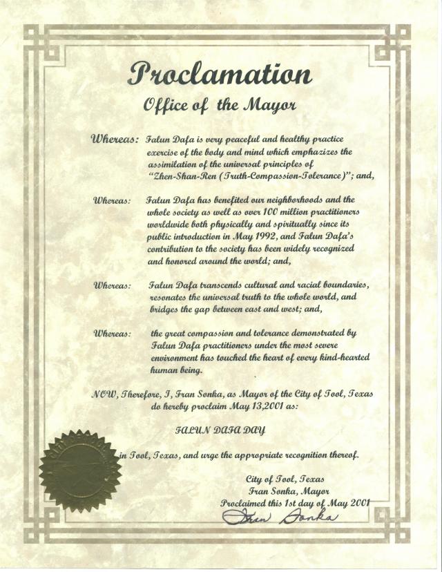 大法弟子:何国章 王志英 田桂兰 马秀英 何首芝 文大必 王朝珍 苟兴兵 余秋华 李香芳 郭宴昌 罗中贤 刘昌琼 代其珍 黄应碧 杨应秀 王留娣 何永贵 杨承玉 林传茵 代仁兵 何永富 张德英 许菊容 2001年4月17日