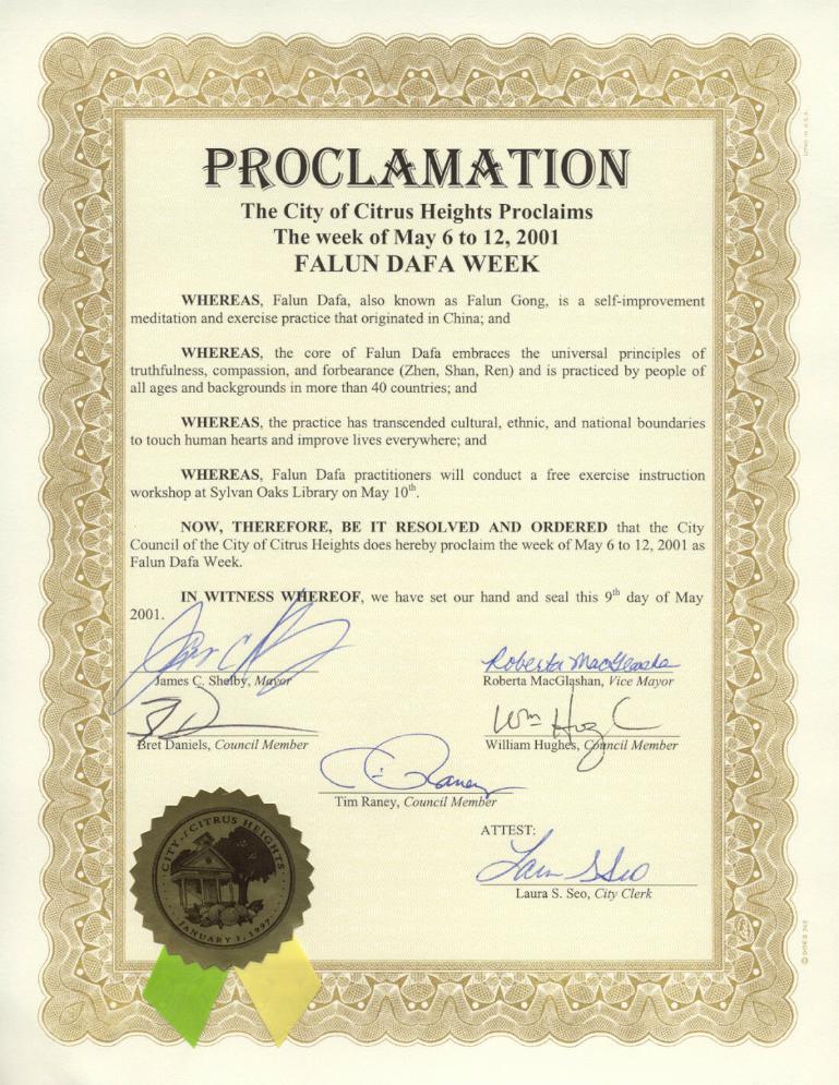 【明慧网2001年5月15日】加利福尼亚州赛特拉斯高地市(City of Citrus Heights, California)宣布2001年5月6日至12日为“法轮大法周”。
