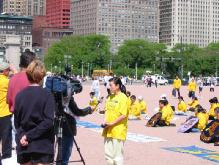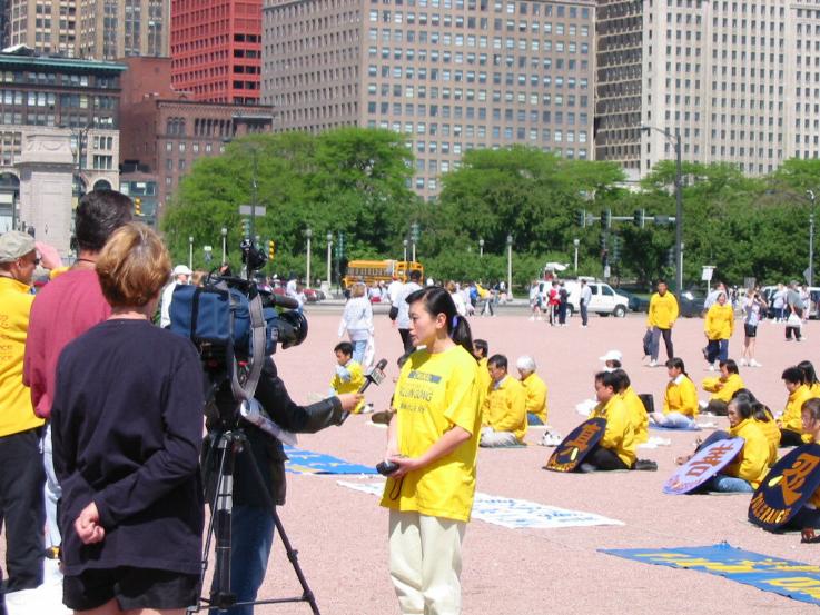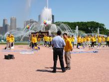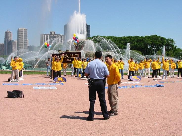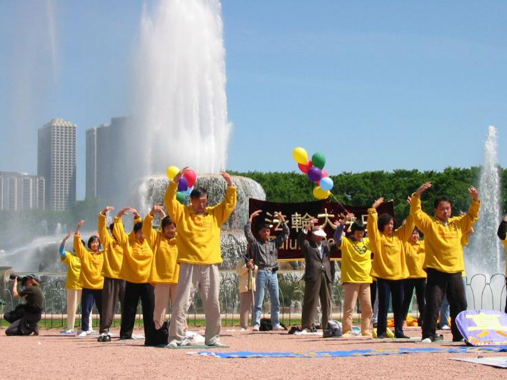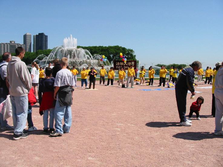 【明慧网2001年5月15日】5月13日,芝加哥的天气出奇的好。明媚的春光普照大地,万里碧空丝丝游云。上午十时许,大芝加哥地区的大法学员纷纷聚集到芝市最著名的景点--白金汉(Buckingham)大喷泉旁,用法轮功学员特有的集体炼功的方式,同庆第二个世界法轮大法日。学员们身着黄色炼功服,整齐地排列在大喷泉旁静静地炼功。周围是繁华的都市,身边是喷射的大喷泉,宁静祥和的炼功场更显得格外引人注目。碰巧附近有一个上万人的大活动刚刚结束,成群结队的人们被吸引过来。不少学员忙着分发真相材料,回答问题。更有一些行人干脆现场学炼功法。一位警察非常感兴趣,和一位学员聊完后非拉着这位学员合影留念。更有不少行人惊讶地说,这么祥和优雅的功法竟然在中国不让炼?!