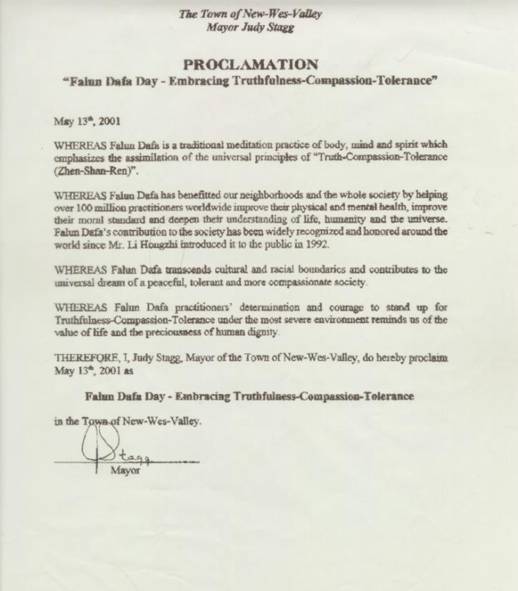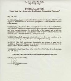 【明慧网2001年5月17日】加拿大纽芬兰省新外斯谷镇宣布2001年5月13日为“法轮大法真善忍日”。