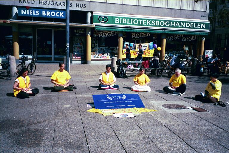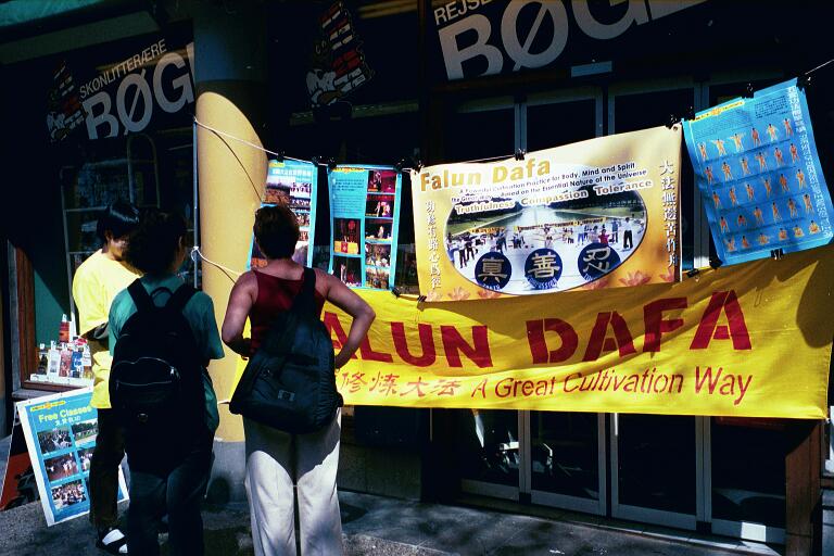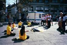 电视台的记者带着摄像机赶到了。我们的庆祝活动在大法炼功音乐中,在我们向世人展示功法中开始。大法弟子排成半圆的队形,祥和,优美的音乐,缓,慢,圆的动作,吸引了不少路人观看。接下来,我们在“普度”“济世”的音乐伴随下,进行了五小时的征集签名。在征签过程中,我们向许多善良的人们解释发生在中国的真相,有一些人接过传单,仔细阅读后,又回来签名。更可喜的是一位中国人,她问了许多问题得到解释后,也签上了她的名。我们为她为自己生命的永远所做的选择而感到无比地高兴。