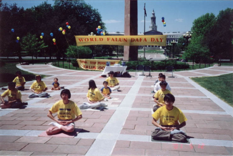 今年五月十三日是第二届世界法轮大法日,标志着法轮大法弘传九周年。科洲法轮功学员于五月十二日,十三日分别在丹佛市州政府前面和华盛顿公园举行了世界法轮大法日庆祝活动。十二日星期六清晨在州政府前面的林肯公园,彩色气球飘扬在空中,来自科罗拉多春城和大丹佛地区的学员挂起了三幅黄底红字的英文大横幅:"法轮大法--真善忍","世界法轮大法日"和"中国:停止镇压法轮功"。在人行道的旁边,学员们还架起了图片展板,披露在中国大陆的法轮功学员遭受的残酷迫害。九时半至十一时,大部份学员静静地炼功,其他的学员给行人发真相资料,揭露江泽民犯罪集团对中国法轮功学员的残酷迫害。祥和炼功的场面令行人驻足观看,同时中国大陆法轮功学员所遭受的迫害令行人震惊,许多行人表示将以各种方式帮助制止江泽民犯罪集团的行为。一些过路司机鸣笛表示支持。在这期间,正好一个汽车游行活动在我们的旁边举行, 学员及时向观众展示五套功法,并将讲清真象的报纸送到了他们的手上。对很多人来说,这也许是他们与大法结缘的珍贵机会。