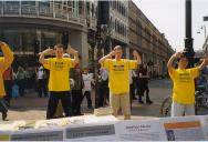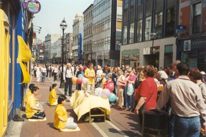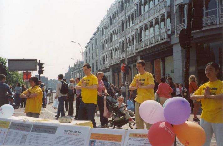 【明慧网2001年5月17日】庆祝“世界法轮大法日”暨李洪志师父传法九周年,爱尔兰学员于5月12日在都柏林最繁华的商业步行街(Grafton)集体炼功、洪法。多雨季节的爱尔兰,这一周来天气却出奇地晴朗,因此过往行人特别多。我们身着黄色炼功服,并在介绍大法真相的展板上装饰了印有“法轮大法”字样的色彩缤纷的气球,颇具节日的气氛。舒美的炼功动作、优雅的炼功音乐和鲜艳的色彩吸引过往的行人驻足观看,并索要简介材料。我们不到一天内竟发出一千多份简介,创历史最高记录。许多小孩索要气球,等我们炼完功时,气球也都送完了。我们悟到,多做一些印有大法字样及网址的气球也是一个很好的洪法方式。