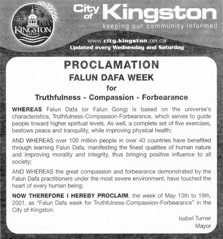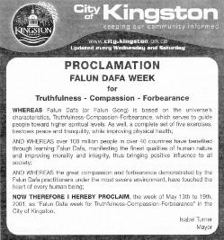 【明慧网2001年5月18日】加拿大安大略省金斯顿市宣布2001年5月13日至5月19日为“法轮大法真善忍周”。