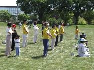 快到中午时,一些摊位上的护士和义工也跑来学功。当她们学完五套功法后,都表示感觉很好。一位护士对我们学员说,七月份她们医院将有个大型活动,她想邀请我们参加。