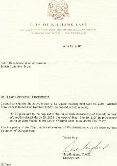 【明慧网2001年5月23日】加拿大不列颠哥伦比亚省维连姆斯湖市宣布2001年5月13-19日为“法轮大法周”。