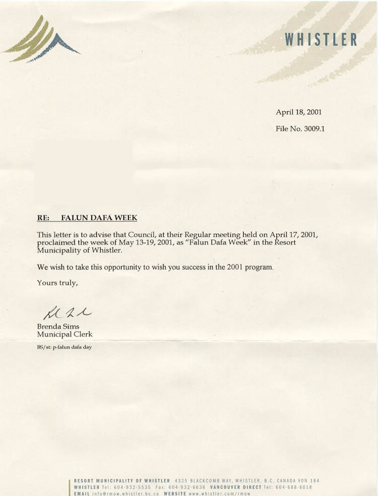 【明慧网2001年5月23日】加拿大不列颠哥伦比亚省威士乐旅游镇宣布2001年5月13-19日为“法轮大法周”。