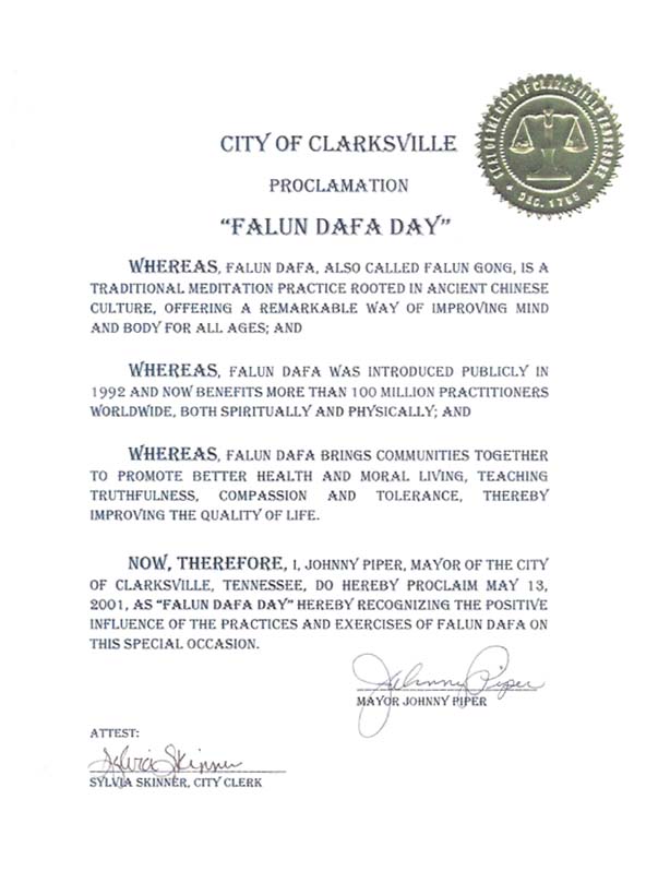 我,约翰尼.派伯,作为田纳西州克拉克维尔市市长,特此宣布2001年5月13日为“法轮大法日”,褒奖这一功法积极的作用。