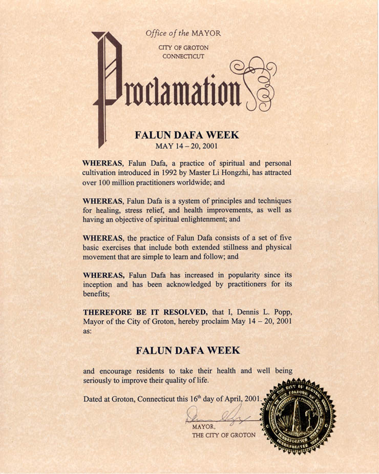 【明慧网2001年5月26日】康涅狄格州格若顿市宣布2001年5月14日-20日为“法轮大法周”。