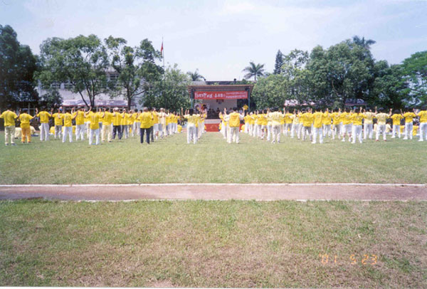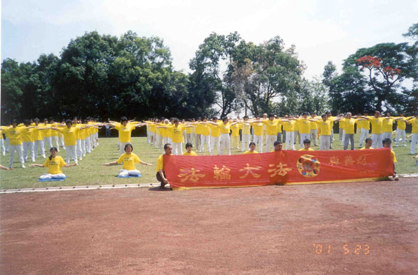 【明慧网2001年5月26日】中国时报2001年5月24日报导 -- 大埤乡嘉兴国小昨天欢度四十四周年校庆,校方并举办乡土周来庆祝,不仅选出茄冬树为校树外,更邀请阿嬷莅校指导学童做乡土味的米苔目、碗果等给宾客吃,小朋友捉泥鳅歌谣表演、台语吟诵诗仙李白的诗词,更让整个校庆充满文艺气息。……昨天中正大学艾昌瑞教授等八十位法轮功学员受邀表演功法,获得满堂采。