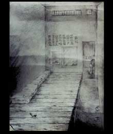 【明慧网2001年5月26日】这是一位中国大陆的大法弟子,曾几次到北京上访,多次被抓,被关押、被毒打、被强行灌食,被迫与丈夫离婚,现已被逼得流离失所,不能与其心爱的女儿相见,下面四幅绘画作品是她回忆起在监牢中的生活及被强行灌食的场面所作: