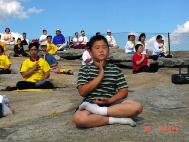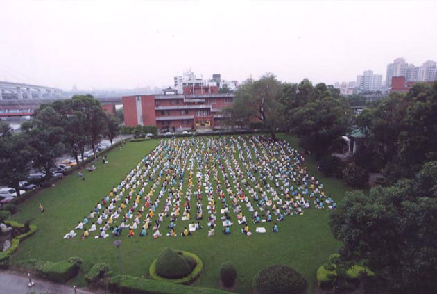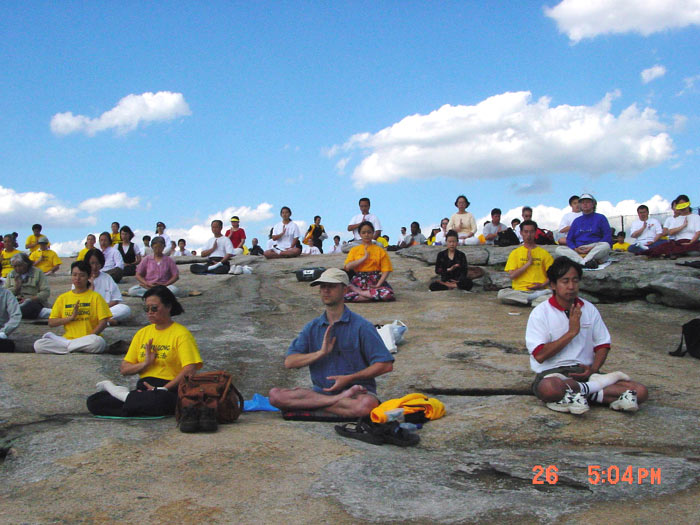 当我四点四十分下来时,空气中没有任何嘈杂的声音,当时我还以为大家都还在楼上准备,没想到,一走下阶梯,整个大草坪几乎已坐满了一千多位大法弟子,大家静静地盘腿凝神等待着。天空这时尚未亮,黑黑的夜里,大法弟子凝聚在一起的力量却使得整个场面显得意外的纯明!