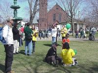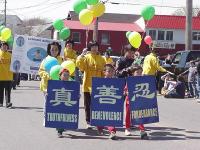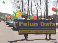 四月二十九日星期日,来自加拿大蒙特利尔地区的三十来位学员,以及来自波士顿地区的二十来位学员不约而同的早早就来到集合地点。蒙特利尔的学员带来几百个写有“法轮大法”及“真善忍”的气球以及一些顶在车蓬上的标牌,波士顿学员则带来了许多大法横幅及报纸。大家有条不紊,忙而不乱的做着各种准备活动:贴介绍会的标签,充气球,摆横幅,装饰汽车,摆放音响…没有什么客套,也没有任何勉强,只是从学员们满面春风的笑脸,从那洋溢着的发自内心的喜悦,就能深深感到学员们那种和平宁静,那种坚定成熟之美。预定游行的时间推迟了一个多小时,大家毫无怨言。负责组织游行的帕特女士很惊奇我们有这么多的人,来自各个不同的地区,而且配合得这么好。她夸我们的队伍是最长最好的。她对学员说:“你知道往年的枫树节总要下雨,今天天气怎么这么好。”我们学员回答道:“因为今年我们来了。”她笑眯眯的似懂非懂。