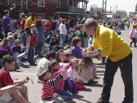 下午两点多钟游行正式开始。走在最前面的是两位拿着“法轮大法”,“真善忍”大横幅的女学员,而后是四辆满载大法横幅的车:领头的第一辆车两边各贴着大大的英文“法轮大法”,其它三辆分别在两侧贴有英文的“真”,“善”,“忍”,巨大的标牌是那样的醒目,远远就能看到。随后便是步行队伍,孩子们走在最前面,三个4-5岁的孩子每人拿一个中英文对照的“真”,“善”,“忍”牌子,欢快的走着。后面是各种颜色的漂亮横幅,十几位学员在队伍的两边忙着发报纸。五彩缤纷的气球更把我们的队伍点缀得异常醒目而喜气洋洋。两边的观众真是人山人海,一层又一层,发报纸的学员一路小跑,还满足不了观众的需要,很多人都主动伸出手向我们要报纸,他们不时念着“法轮大法”,“真善忍”。很多人迫不及待的打开报纸,当时就看了起来;有些人则议论着:这就是在中国被禁的法轮功…人们的注意力似乎被我们祥和的能量场所吸引:欢快的孩子;身着黄绒衣的人们;长长的队伍;各种颜色的“法轮大法”,“真善忍”的横幅;五彩缤纷的气球;悦耳动听的普度音乐;以及几千份大法报纸…相信给观众留下了难以磨灭的印象。还有些学员则通过征集签名的机会,向人们介绍法轮功并讲清真相。法轮大法终于在圣阿本播下了种子。