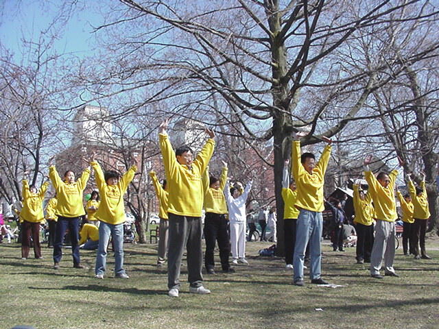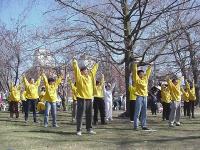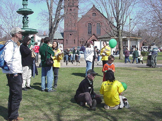 游行结束后,我们又在市中心的公园集体炼功。公园的草地上仍然是人潮如流,我们静静地炼着五套功法,吸引了越来越多的人驻足观望。很多人走上前来主动和学员交流。一位男士和学员谈了很久,问了许多问题,直到炼功结束,还恋恋不舍;另一位男士认真地看着学员炼功,问一旁的学员:“中国为什么要镇压法轮功?”学员耐心的跟他说明真相,解释了中国政府造谣的背后真正镇压的邪恶目的以及对“真善忍”的惧怕,他听了很好笑也很满意,说:“我终于明白了。这个功法很平和。”一位十几岁的女孩和她妈妈特地走过来要报纸,当得知周六在另一不远的城市有法轮大法的介绍会时,她妈妈说:“我一定去,我就住那。”一位男士和学员交谈时说:“在这个城市绝大多数是白人,你们是怎么找到的呢?我们很高兴你们能参加。我们需要它(法轮大法)。”并给我们提建议说:“你们应该(给观众)讲解动作的要领,不要只是表演。”还有很多人问及下一步我们怎么打算,是否会在本地有介绍班,很多人表示有兴趣学。还有一位女士则告诉学员在哪有洪法的机会等等。感到很多人长久的等待,似乎就是为了这一刻。