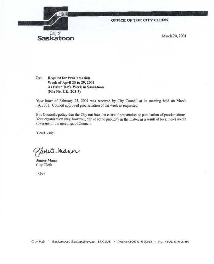 【明慧网2001年5月3日】加拿大萨斯喀彻温省萨斯卡通市宣布4月23-29日为“法轮大法周”