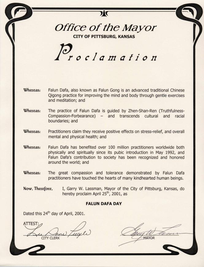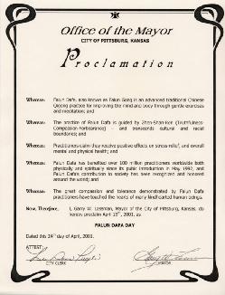 【明慧网2001年5月4日】堪萨斯州匹兹堡市宣布2001年4月25日为“法轮大法日”