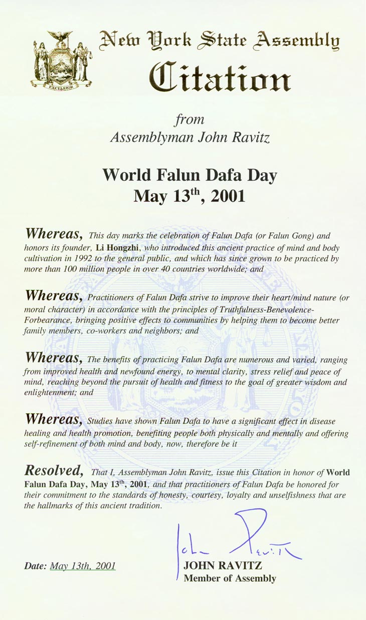 【明慧网2001年5月6日】纽约州众议员约翰.拉维兹(John Ravitz)褒奖2001年5月13日“世界法轮大法日”
