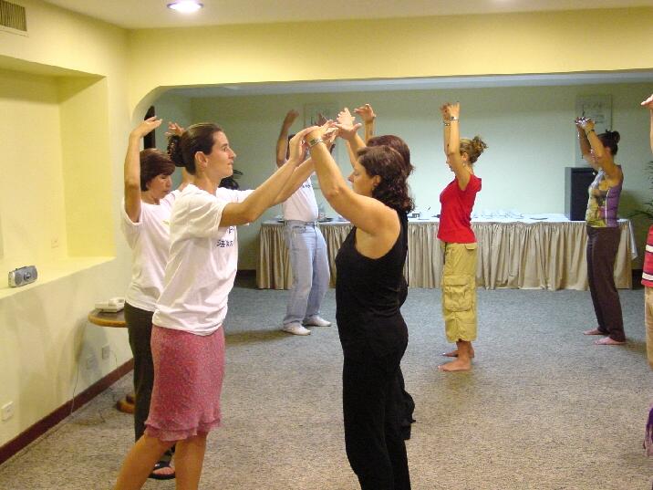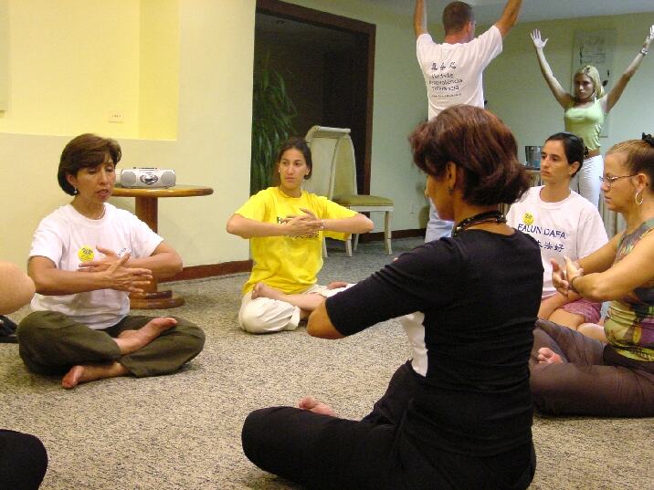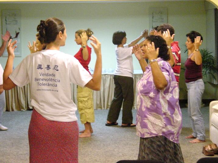 一到圣保罗的公园,我们开始寻找一个炼功和教功的好地方。我们注意到公园中有许多人都穿着白色T恤,这印证了我们认为我们选择的颜色将受到拉美朋友欢迎的想法。在珍奇鸟类栖息的美丽湖畔,我们注意到便道旁有一个水泥平台。那里空无一人,所以我们觉得这是一个炼功的好地方。我们放下垫子,打开炼功音乐开始炼功。在第一套功法结束时,有不少人在观摩我们炼功并询问问题。在第二套功法结束后,人越聚越多。等到第3套功法结束时,已经聚集许多人了。我睁开眼睛,注意到许多人都穿着印有蓝色字母的白T恤。开始我有些奇怪,等我走近观察才发现他们的T恤上印着另一个气功学校的名字。