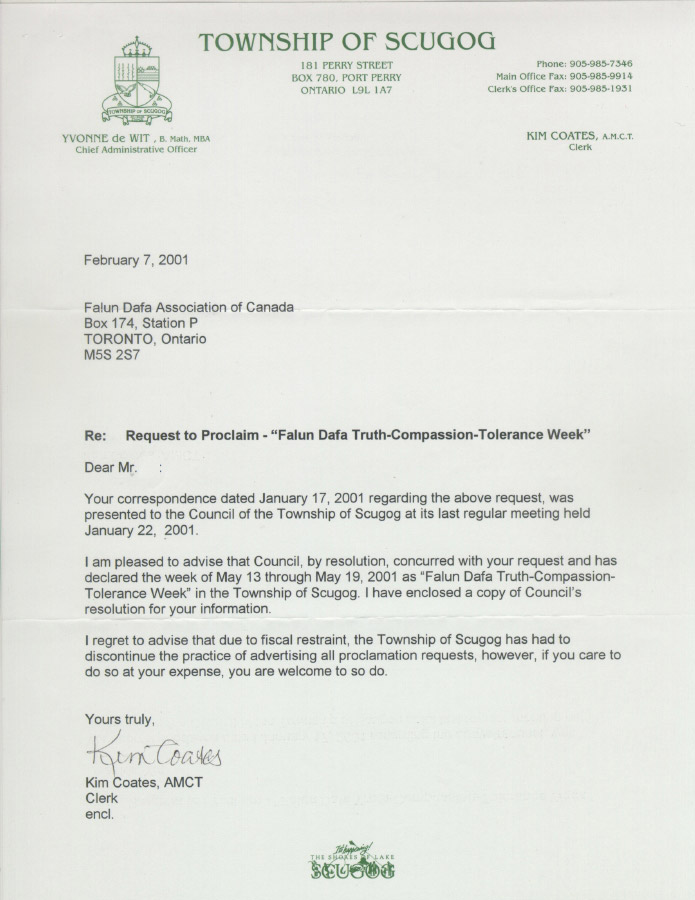 【明慧网2001年5月9日】加拿大安大略省斯谷克格镇宣布2001年5月13日至5月19日为“法轮大法真善忍周”
