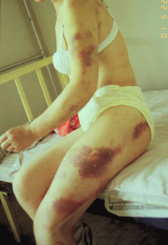 最后我被打倒在地难以爬起,门牙被打掉了两颗,头部多处被击伤,浑身肿胀发紫,骨头像散了架一样,但这个恶警竟然兽性大发,又朝我右耳及太阳穴处猛击一棍,将我打昏,在我昏迷的时候,这个禽兽不如的恶徒竟然将我拖到桥下,撕开我的裤子,将我强奸。而后更全无人性地把胶皮棍猛劲插入我的阴道里,他却骑到我身上。等我缓过点劲,能喊出声的时候,我竭力地呼喊:“救人哪!抓流氓!”这个恶徒却仍有恃无恐。直到我声明要去派出所告他,他才慌了,丢下我骑车逃跑了。