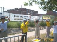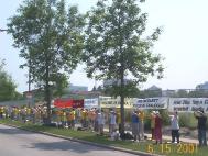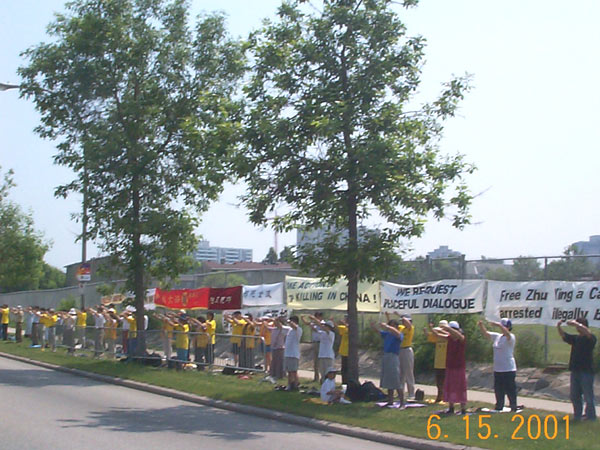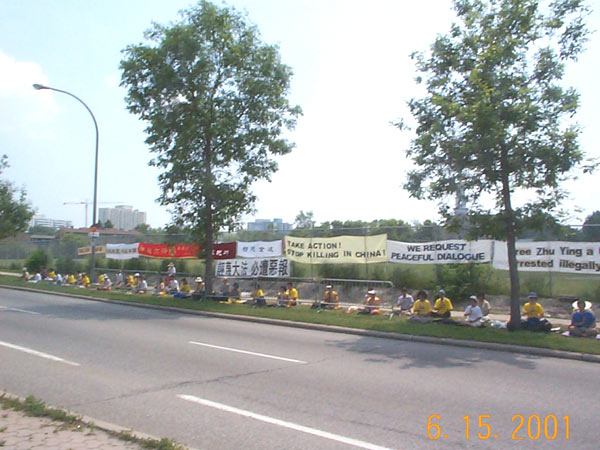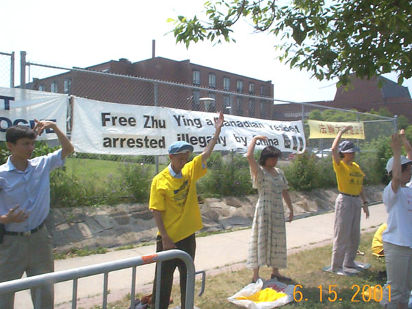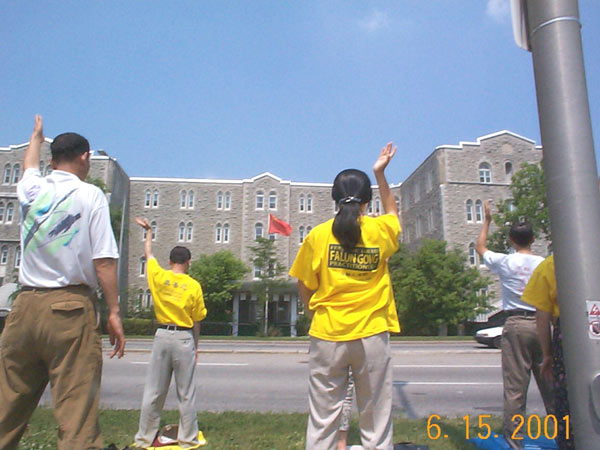 【明慧网2001年6月17日】今天渥太华和蒙特利尔的学员来到渥太华中国使馆前呼吁中国政府释放被非法关押的法轮功学员朱颖、林慎立。学员们集体炼功并发正念铲除邪恶。过往车辆非常多,当人们看到学员的呼吁时,纷纷鸣笛或向我们挥手致意以示支持。一位住在蒙特利尔的西人从使馆办事出来,看到我们在这里炼功,走过来用熟练的中文与我们攀谈,并取得与蒙特利尔学员的联系办法,表示要参加我们的九天班。