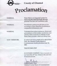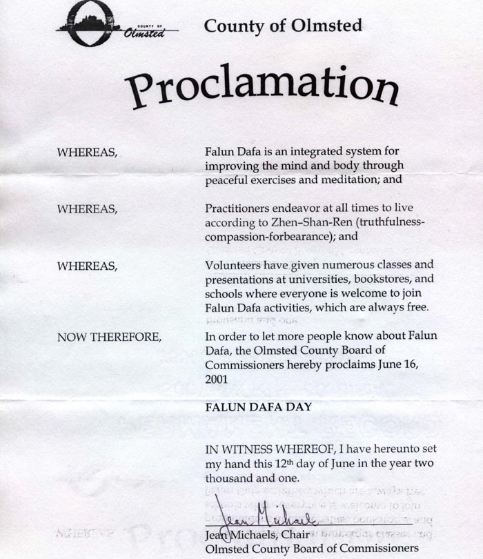 【明慧网2001年6月18日】明尼苏达州欧姆斯特郡宣布2001年6月16日为“法轮大法日”。