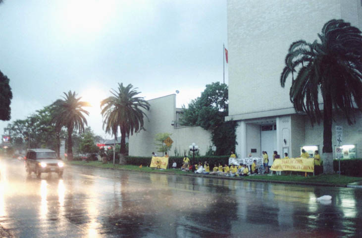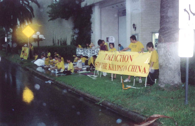 【明慧网2001年6月2日】这两张照片是5月26日我们在中国驻休斯顿总领馆门口参加全世界大法弟子“发正念”活动时一个过路的美国小伙子照的。当时是第二次发正念以后,狂风大作暴雨倾盆,负责照相的学员赶去扶横幅。这个小伙子正好路过,抓拍了几个镜头,然后他赶回家取来了摄像机录了一段现场。第二天,他特意将冲洗出来的照片送到领馆门口我们炼功请愿的地方。