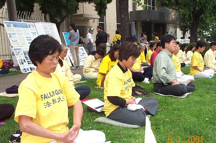 今天的活动除了照例反复演炼五套功法外,每炼一套功法前,都增加了“发正念,清除邪恶”活动。开了天目的学员看到,中领馆前确实很邪恶,刚一坐下,一群群的恶魔就向学员扑来,这些魔多数是动物形像,有的还穿着人的衣服。一群小鬼挤在一辆车上冲过来,学员刚一做立掌的动作,它们就消失得无影无踪了。