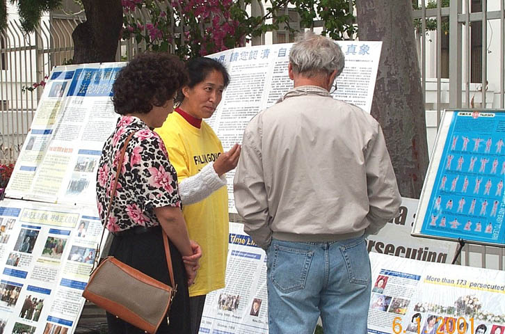 摆在草坪上的宣传板吸引了不少路人驻足观看,有些人看得非常仔细。一对来自德国的夫妇,看完了宣传板,还和学员攀谈起来,对中国大陆学员遭受的残酷迫害深表同情,他们表示,回去后要到大法网站上仔细看看,多了解一些法轮大法。