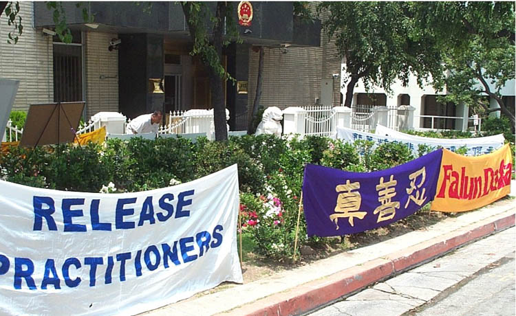 请愿过程中,中领馆一个屡次无理取闹的工作人员跑出来,指着挂在领馆门前的横幅说:“把这些东西拿走!你们不拿,我们就给你们扔了!”说着就撕下两条横幅扔在车来人往的马路上。学员坚持把横幅放回原地,并叫来了警察。几位警察来到现场,弄不清挂横幅的地方是属于哪方领土,乾脆把管理房产的经理请来。经理明确表示,这里是美国领土,可以挂横幅。但领馆人员还不甘心,要求挂远一点,学员说:“就是给你们看的,远了你们能看清吗?”“对,这样很好!”那位美国经理说。一位看上去是领头的警察临走时还要了一些大法资料。