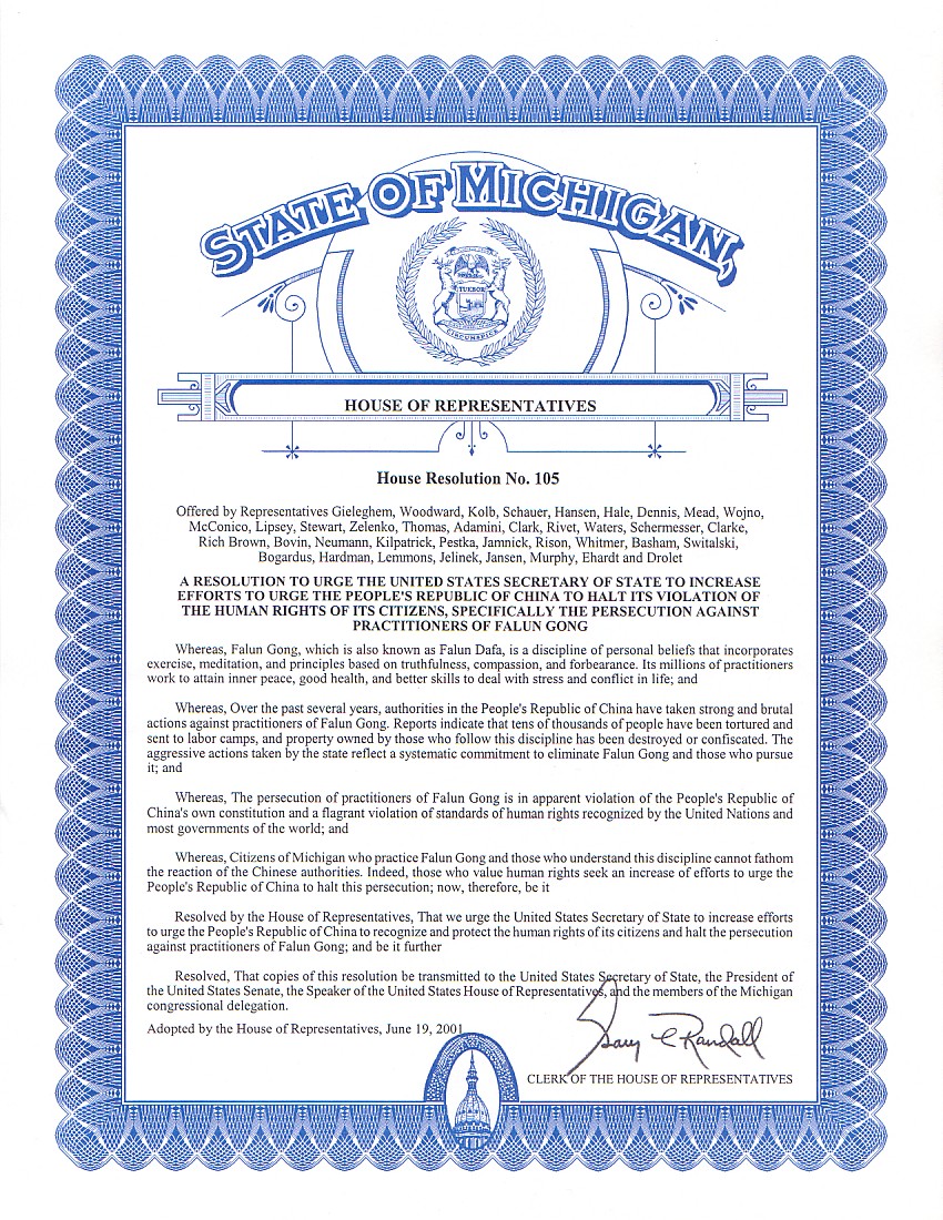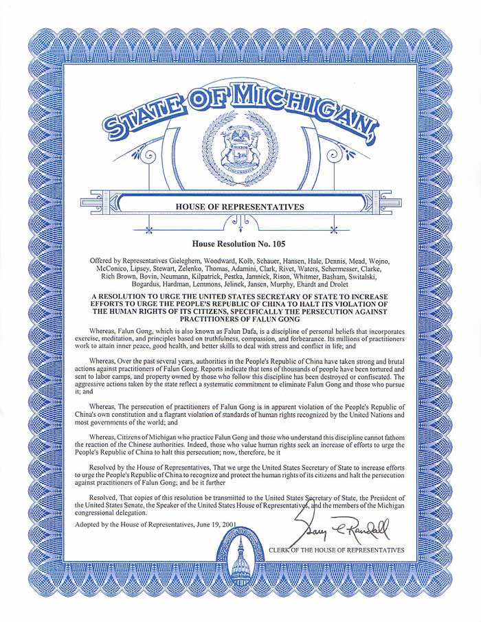【明慧网2001年6月22日】 6月19日密歇根州众议院通过了州议会105号决议案,敦促美国国务卿进一步要求中国政府停止对法轮功修炼者的