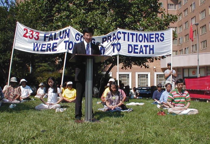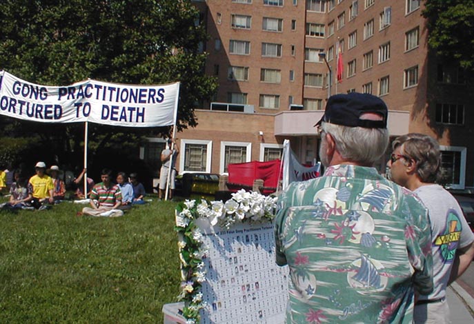 日”。上午十点,华盛顿DC的弟子们利用这一特殊的日子在中国大使馆前召开了新闻发布会。揭露江泽民政府为了达到残酷