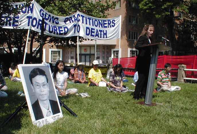 ,强迫孕妇堕胎,强奸,放蛇和蝎子咬。到目前为止已有234名法轮功弟子被折磨、暴打致死。一位具有美国公民身分的李江帆博士在新闻发布会上作证,披露他兄长李白帆讲师被公安谋杀于「洗脑班」的案例。另一位学员揭露了大陆的女法轮功学员遭恶警强奸的暴行。法轮功学员希望通过媒体呼吁停止发生在中国的对法轮功学员进行虐杀、停止使用酷刑。几家中文和英文媒体进行了现场采访。(2001年6月26日报道)