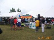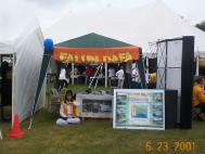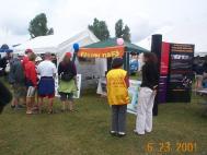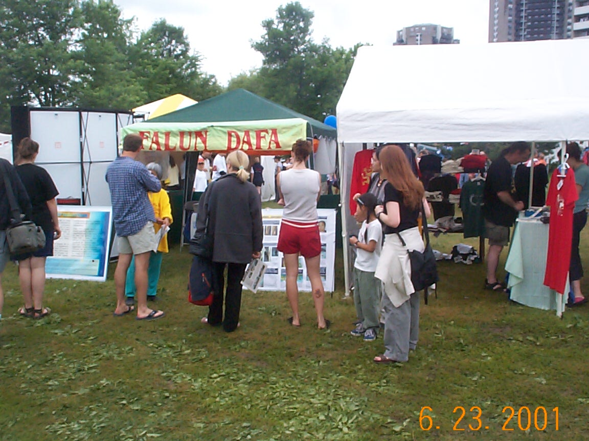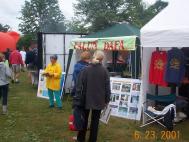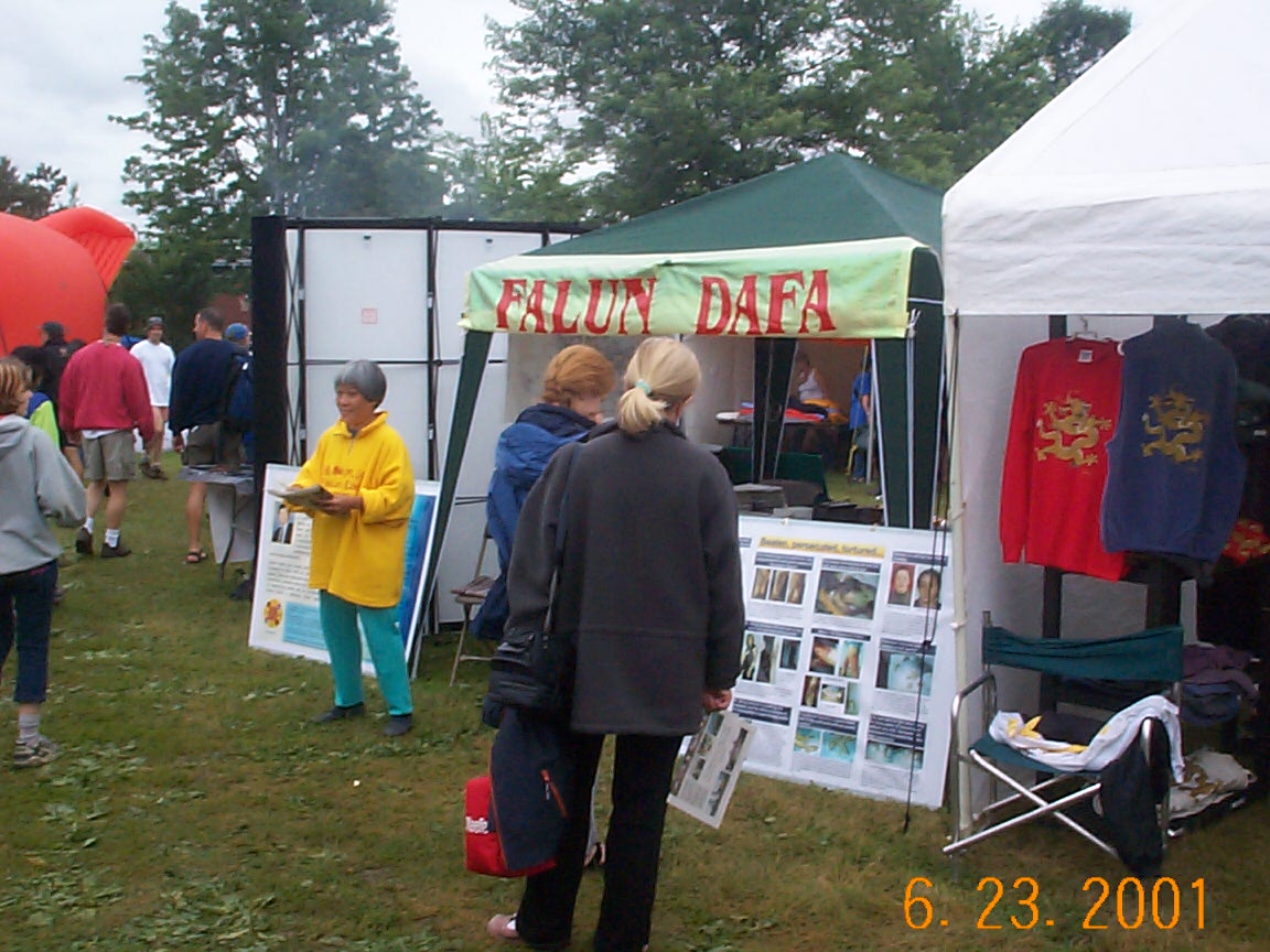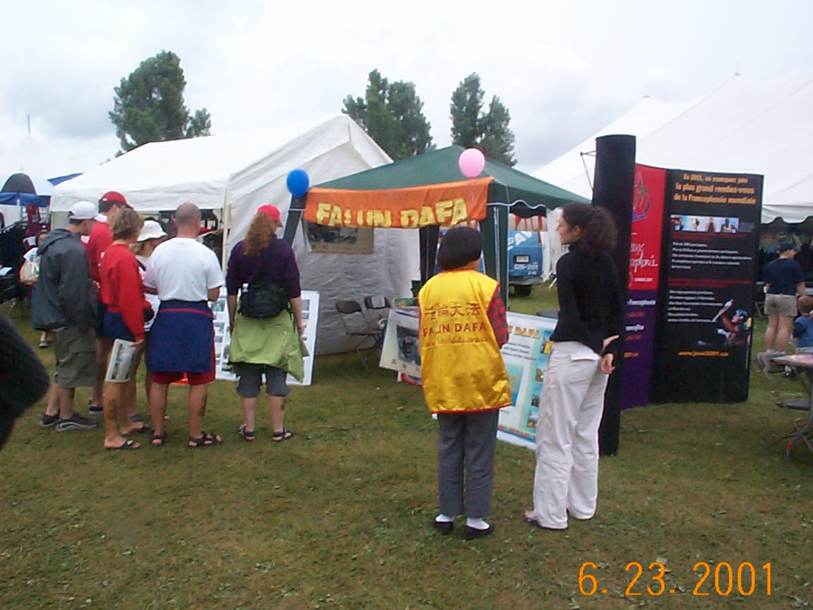 学员们布置好展位后开始炼功和派发真相报纸。我们的摊位位置非常好,在文艺演出主会场的对面,过往的人们都可以看到我们,很多游人都驻足观看我们的展板和功法表演。