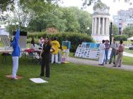 学员们布置好展位后开始炼功和派发真相报纸。我们的摊位位置非常好,在文艺演出主会场的对面,过往的人们都可以看到我们,很多游人都驻足观看我们的展板和功法表演。