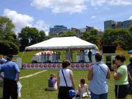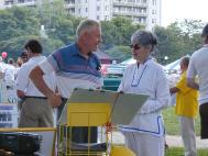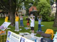 西人学员(60多岁)马克思站着发了一天报纸。他的腿里有钢钉(战争时受伤),“这么多人得闻法,我很高兴。”他说。简在我们炼功时在会场解说。她说这是去我怕心的。大家为他高兴。两天发生太多的故事。我们感到整个节日现场都在我们的场中。功友们演示时感到场很强。有位西人学员刚到公园门口就感受到强大的能量场。