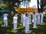 有位美国老兵,越战时子弹穿过他的胳膊和腿。他坐在轮椅上学功。由于不太方便,他说我看着你们炼。我很尊敬你们,我家就在这附近,我以后会经常到你们炼功点来看你们。这两天来有许多5到10岁的小朋友来学功。我们给他们发了真善忍书签,小旗帜。一次,三个小朋友路过我们这里,我们功友正在抱轮,一个小朋友“嘘”不让别人发出响声怕打扰安静。他们愉快的学了功。有位6岁左右的小朋友说,我怕我炼功飞起来。还有位小姑娘虽然父母及他的小朋友催她走,她还是非常认真的学了5套功法。临走还恋恋不舍并谢谢我们。
