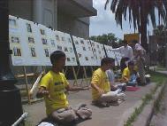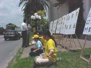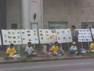中文媒体准时赶来参加;一位大法弟子详细地向记者叙诉中国江泽民集团近日打压法轮功升级、死亡人数增加的现象,记者认真地将这些记录下来,不时地提出问题,记者观看了所有的八张大展板,并拍摄展板上的图片,这些展板的图片是江泽民犯罪集团对法轮功和法轮功学员残酷迫害的记录,大法弟子还专门给了记者一些有关法轮功学员被迫害的资料和天安门"自焚"真相的录像带。正值中午时间,中领馆午休,前来办理签证的中西人员在等待期间,纷纷来观看展板,大法弟子向他们一一散发了中英文有关揭露邪恶的资料。一位美国中年妇女认真地观看法轮功学员受酷刑后遍体受伤的图片,她看着看着,悲伤的泪水不停地流下来,一位大法弟子对她说:"我们到中领馆前,不是反对政府,是为了呼吁中国让法轮功学员享有公民应有的基本权利和信仰自由,中国的法轮功学员仅仅为了炼功,为了信仰真、善、忍,受到了最残酷的迫害。"