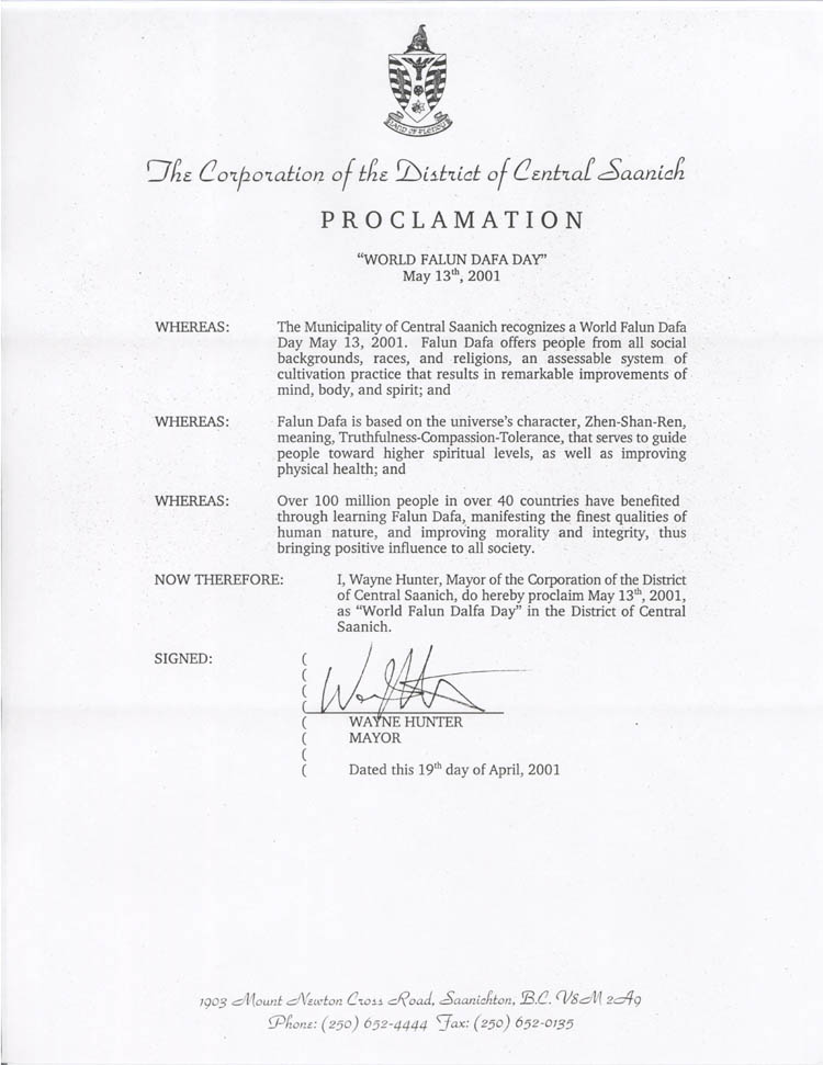【明慧网2001年6月3日】加拿大不列颠哥伦比亚省萨尼科市宣布2001年5月13日为“世界法轮大法日”。