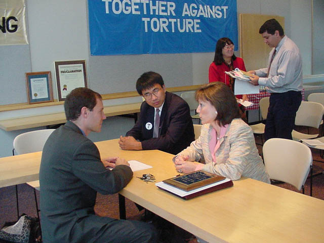 堪萨斯州的国会代表丹尼斯.莫尔专门为新闻发布会写了致辞,并为由于正在华府工作而不能亲临会议而表示遗憾.他委托他的当地办公室工作人员代为宣读该致辞。以表示对于法轮功学员在中国所遭受的酷刑及虐待的深切同情,他强烈呼吁中国政府停止镇压法轮功。在致辞的结束,他写到:我要把法轮功的精神“真,善,忍”带到我的工作中。堪萨斯州议员凯伦.蒂维塔做了长达10多分钟的讲演。她强烈呼吁中国政府停止镇压法轮功,停止酷刑法轮功学员。两州的部分遭受酷刑及囚禁的幸还者们讲述了她们在中国的遭遇。法轮功学员遭受酷刑迫害的真相录相片把会议推向了高潮。会后,凯伦与学员们又进行了长时间的讨论。她表示要尽她的最大努力帮助法轮功学员。望着她那真诚的目光,紧紧地握着她的手。我们从心里为她高兴,她为自己及她的人民做了一件最伟大的事。堪萨斯州议员大卫.哈夫也到会表示支持。