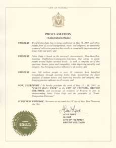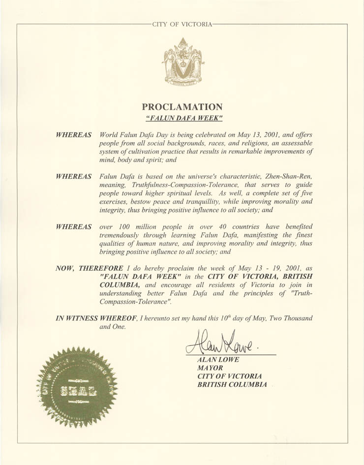 【明慧网2001年6月4日】加拿大不列颠哥伦比亚省维多利亚市宣布2001年5月13日至19日为“法轮大法周”。